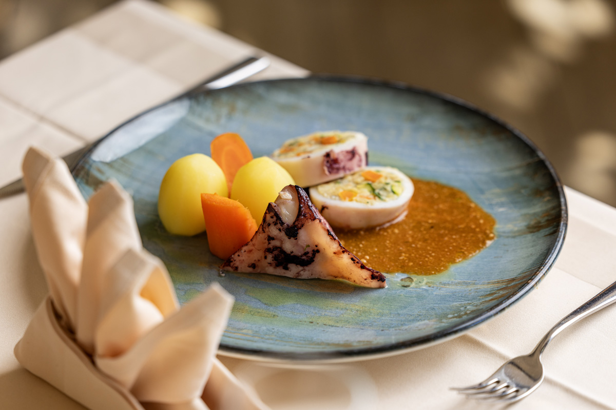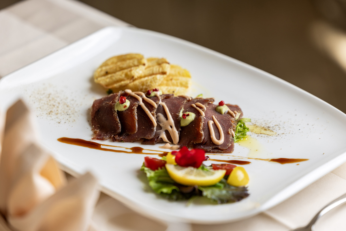 • marinirana tuna u smeđem šećeru, soli s umakom od meda, gorke naranče, mediteranskih trava i začina