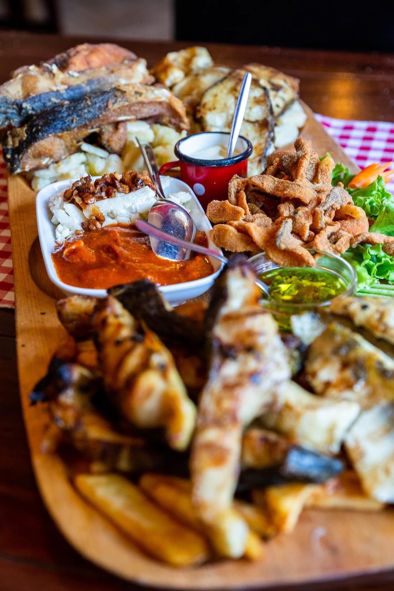 • riba na baranjski (deverika dimljena i kuhana u ulju 12 sati, povrće, sir)